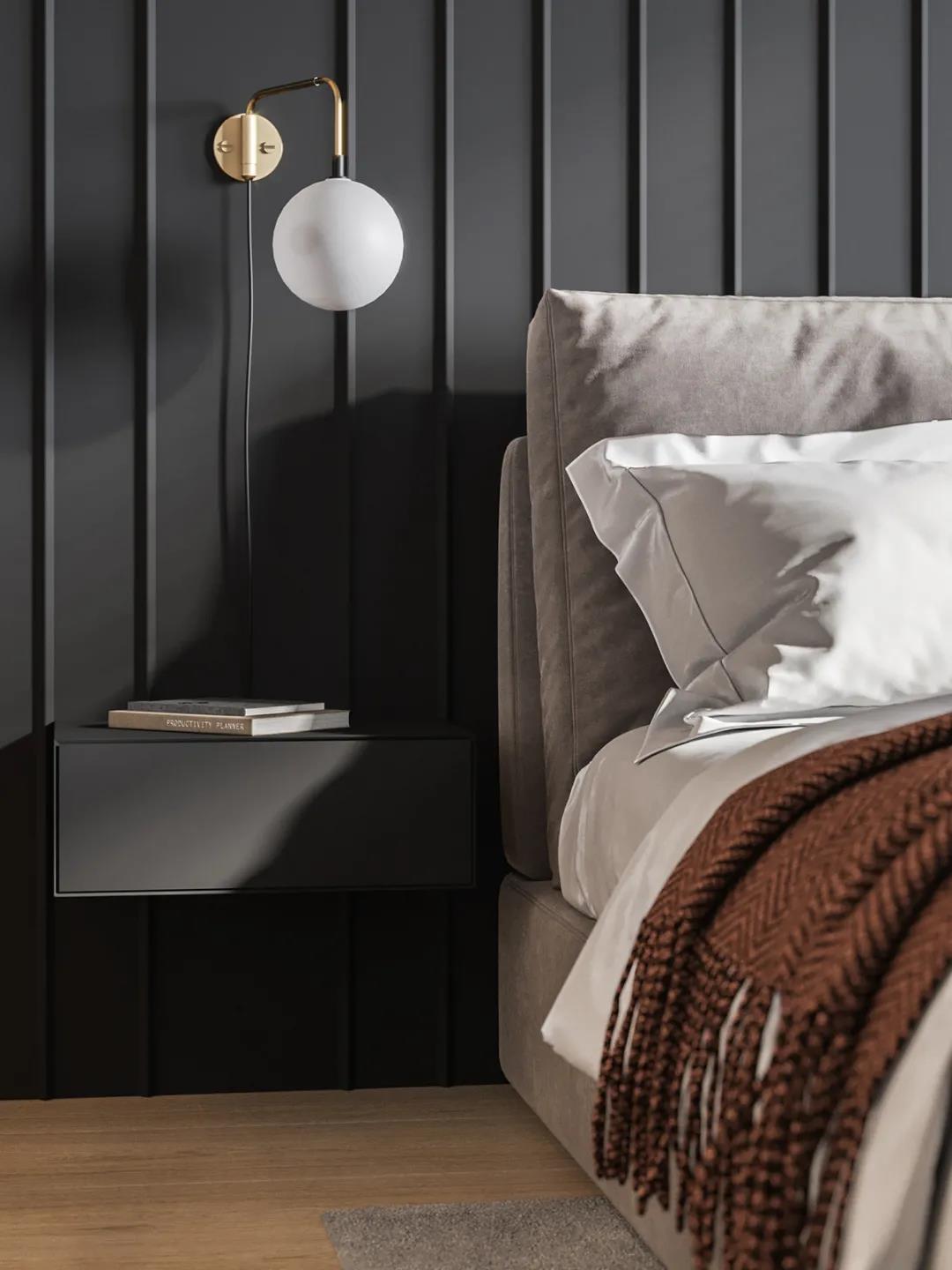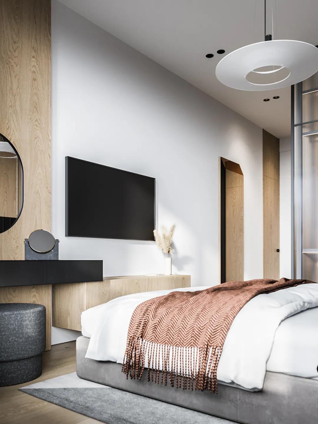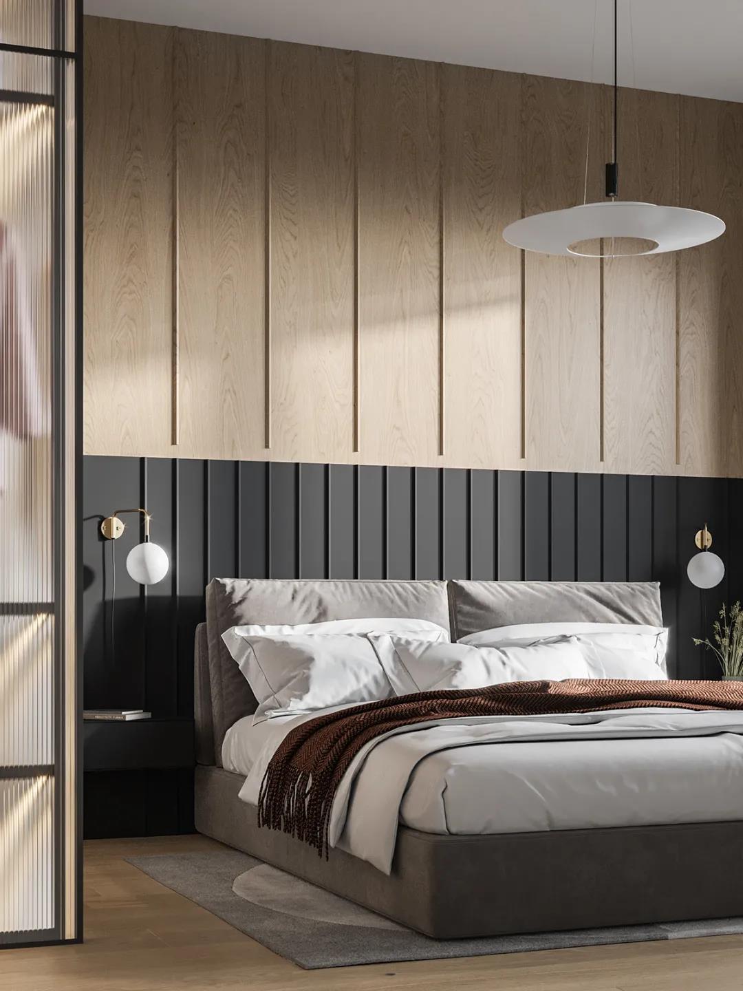 主臥的背景墻用裝飾板和木板作為拼接,寬和窄的對(duì)比彰顯出放蕩不羈的個(gè)性。