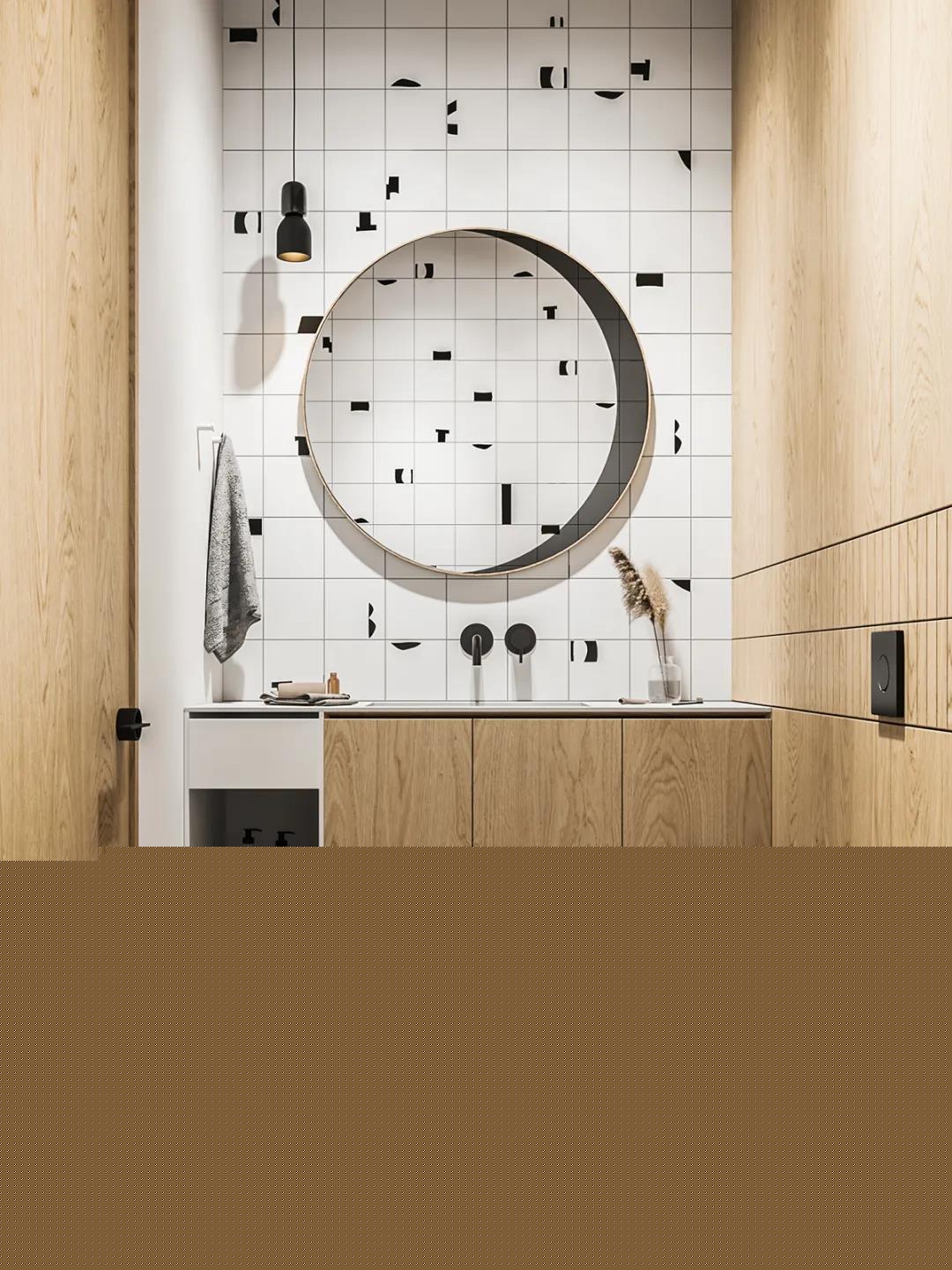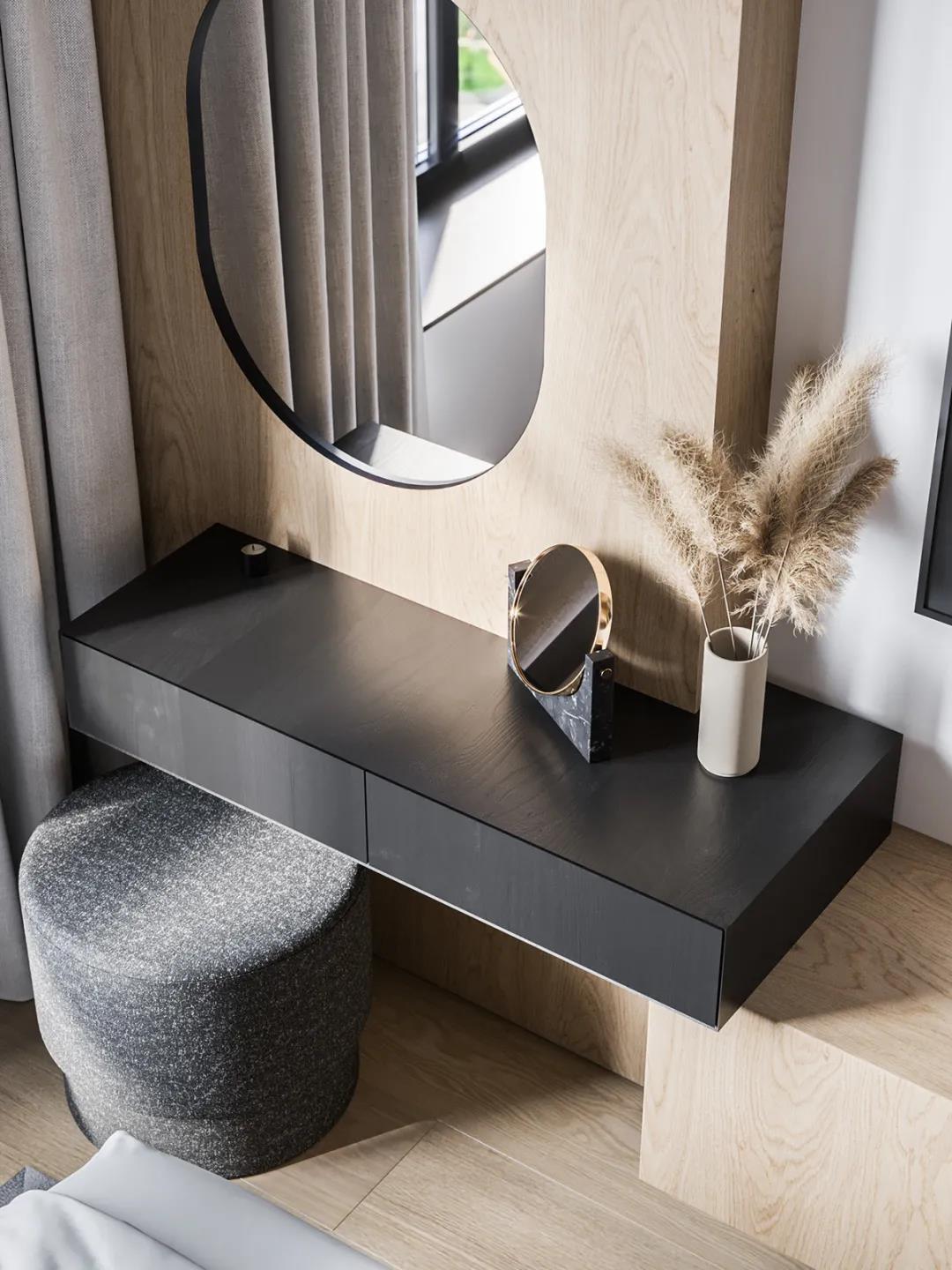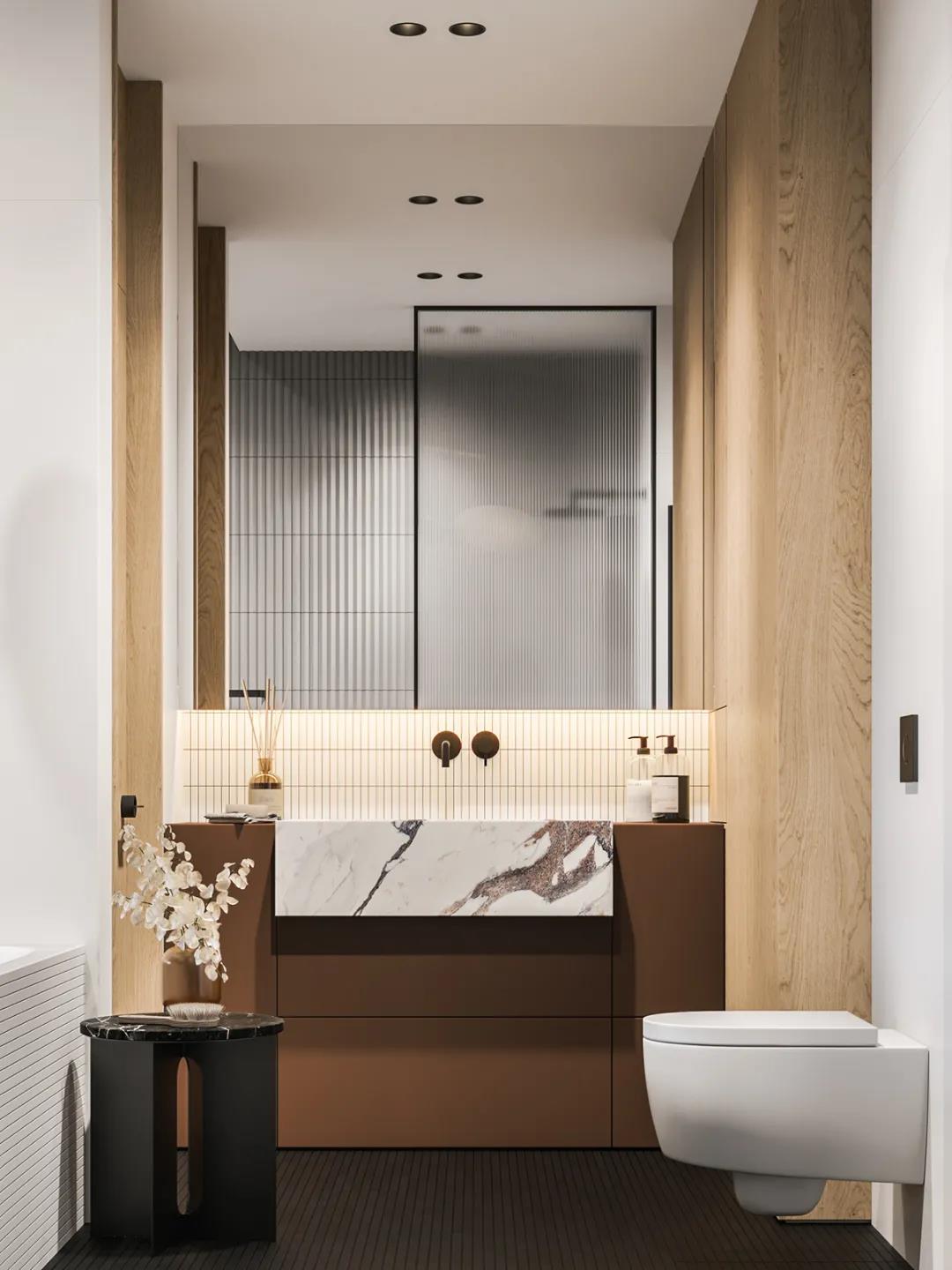 主浴雖然缺少了沐浴空間,但設(shè)計(jì)師利用背景墻做了大面積隱藏式的收納柜,足夠住戶日常收納使用。