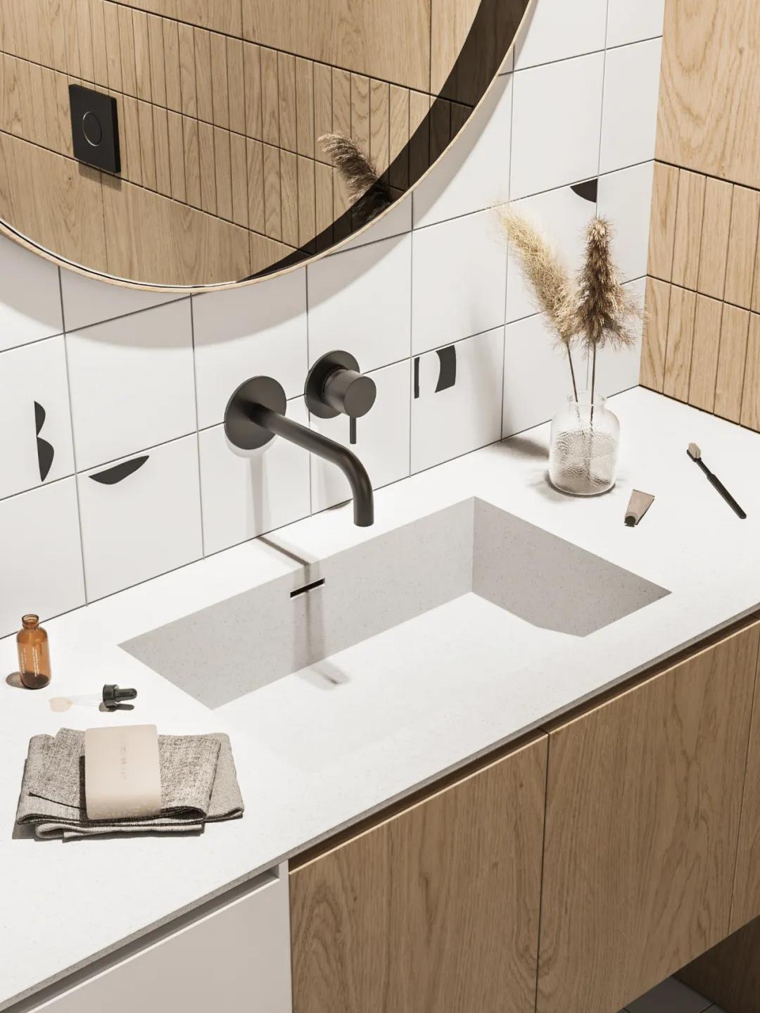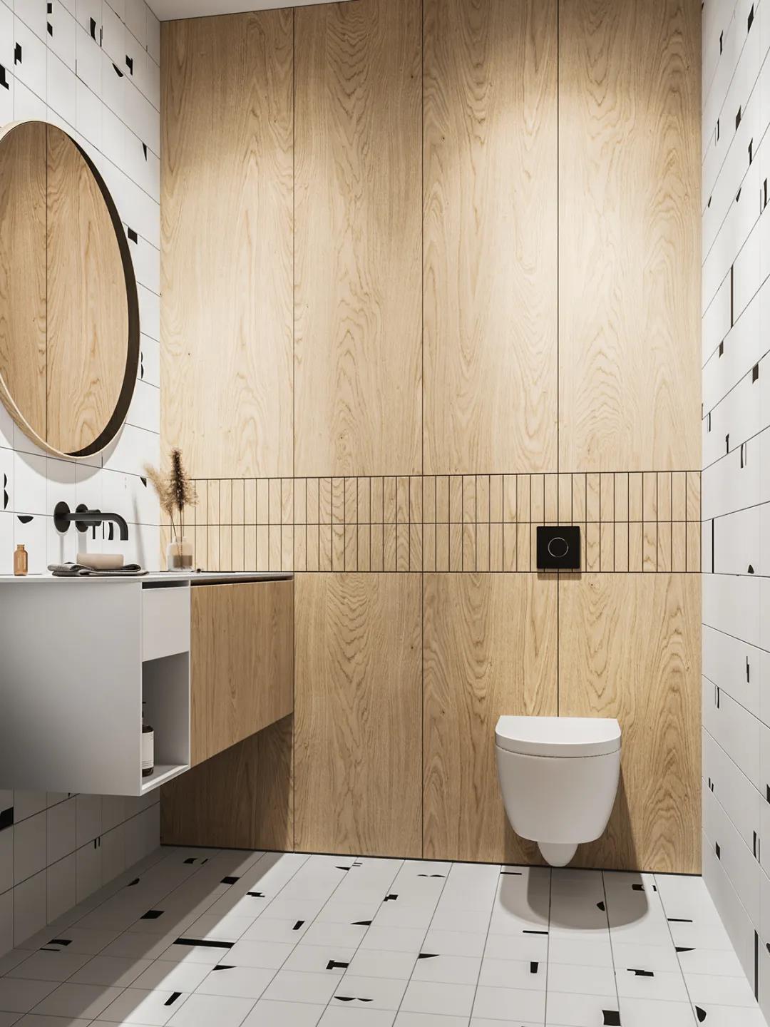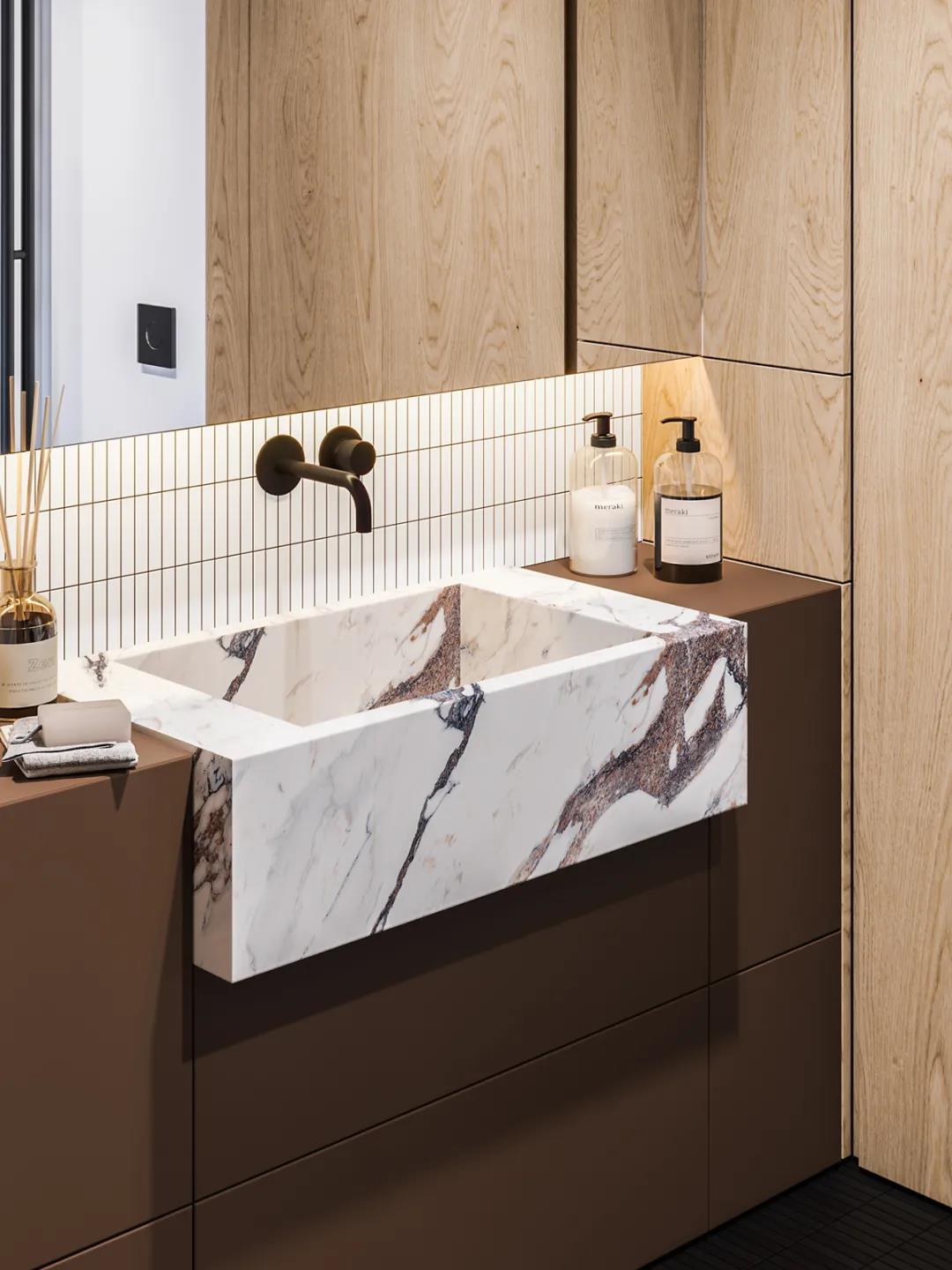 主浴雖然缺少了沐浴空間,但設(shè)計(jì)師利用背景墻做了大面積隱藏式的收納柜,足夠住戶日常收納使用。