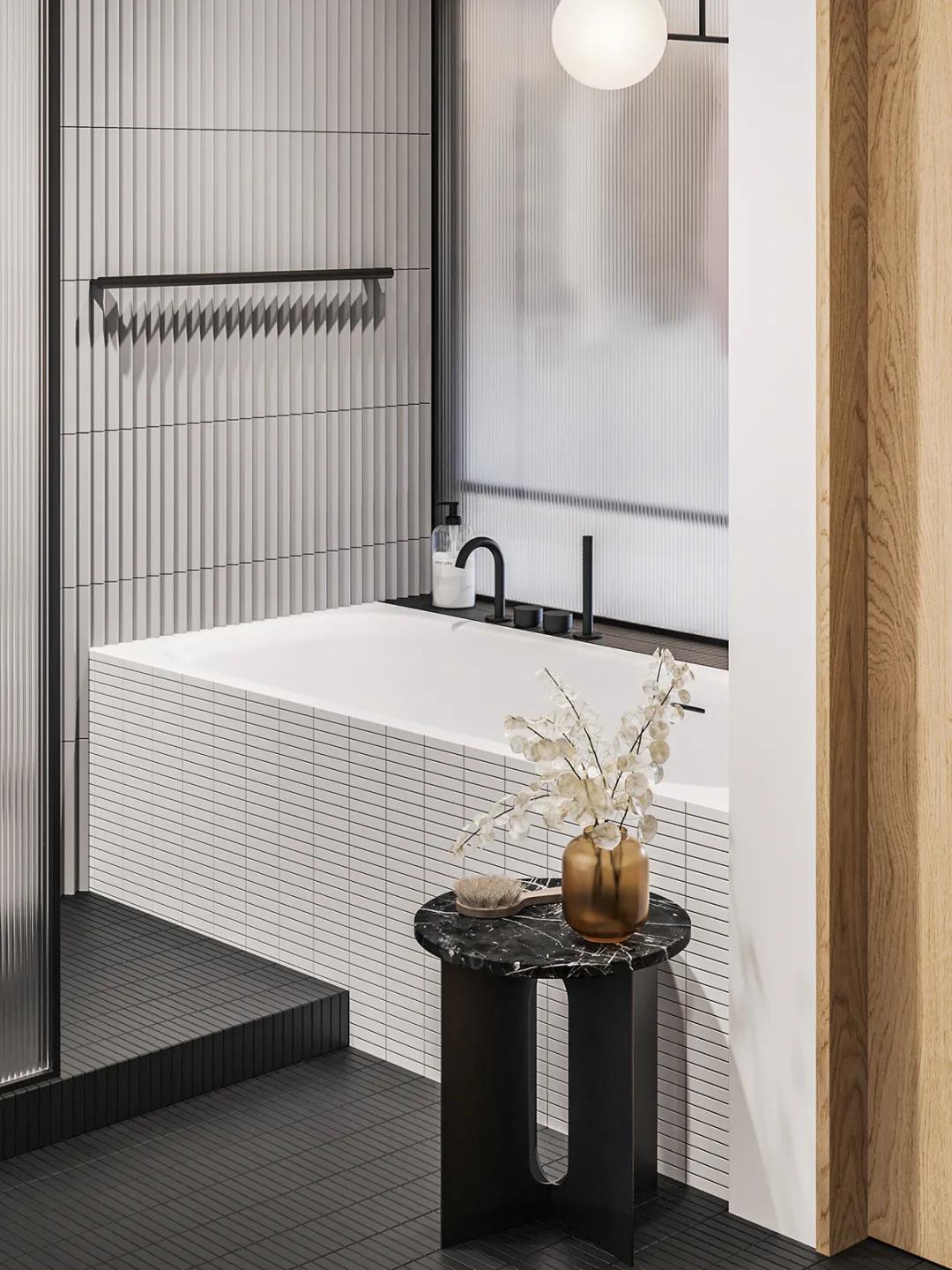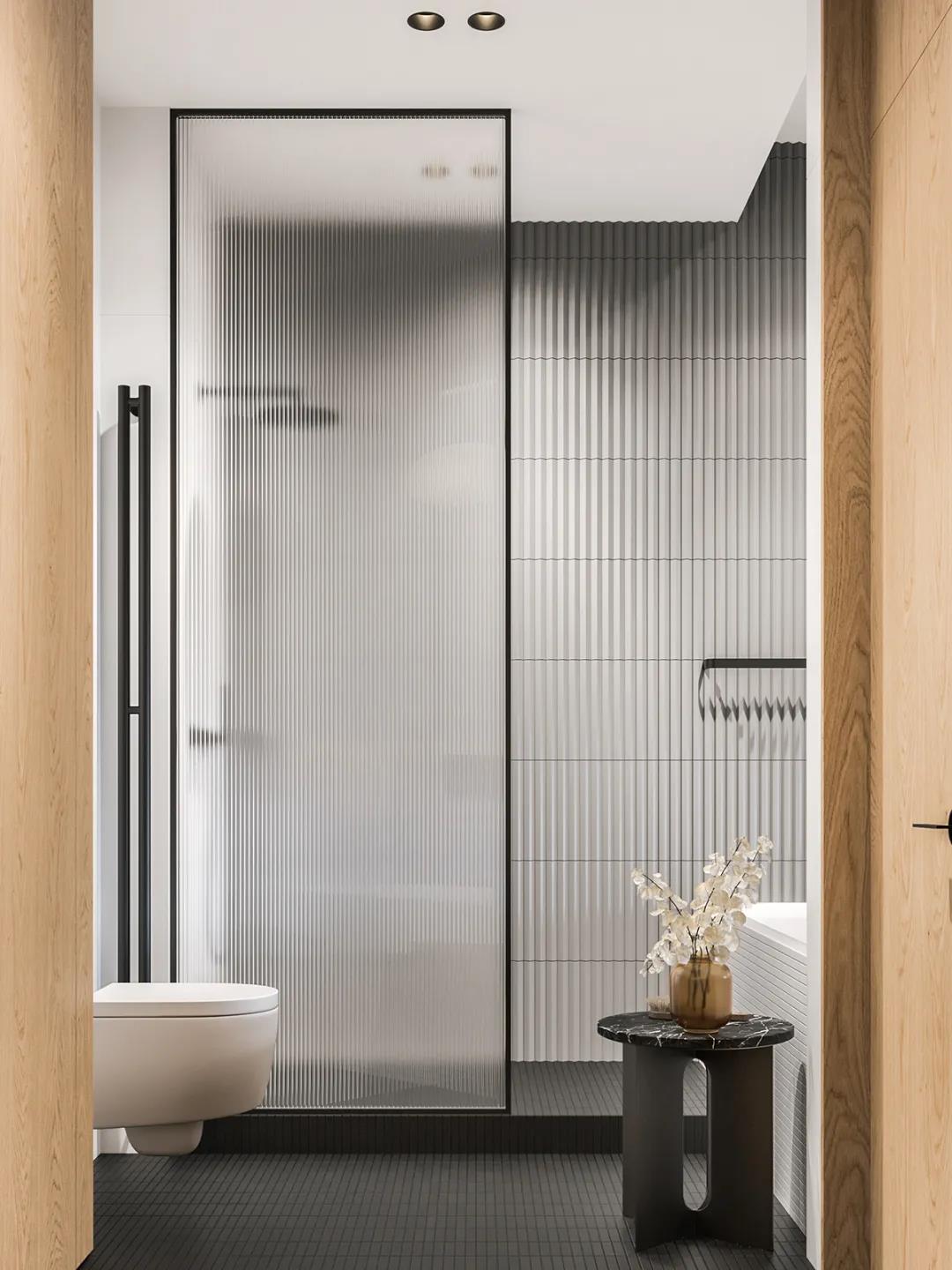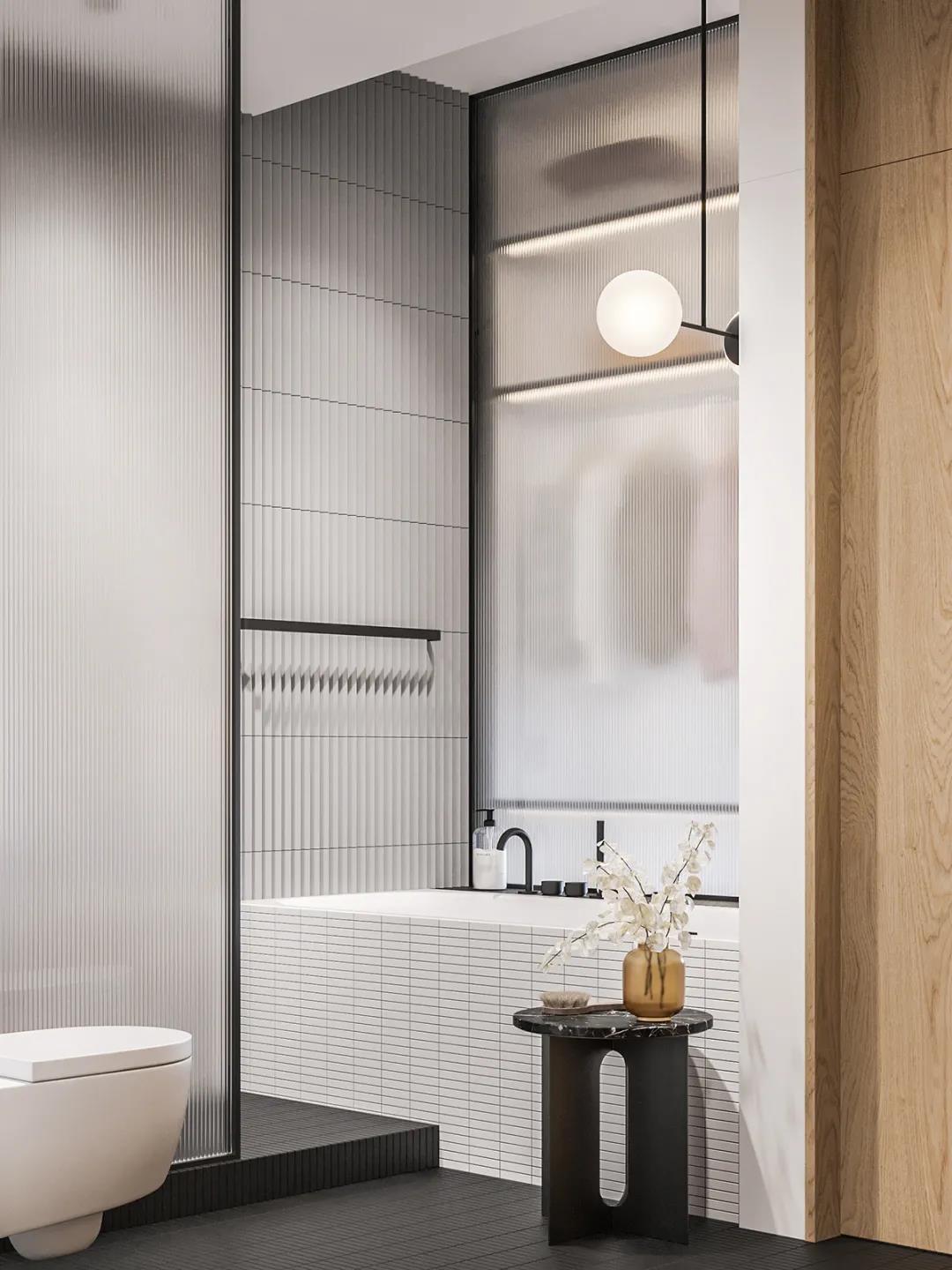 浴室的面積雖然較小,但好在條理分明,設(shè)計(jì)師采用簡(jiǎn)單的四位一體清楚地劃分了沐浴空間、浴缸、洗漱空間和馬桶區(qū),并且利用長(zhǎng)虹玻璃進(jìn)行有效地干濕分離。