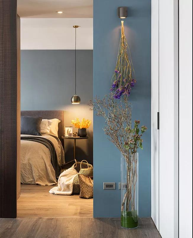 ▲藍(lán)灰色的床頭背景墻上掛著水墨蓮花,表達(dá)主人“出淤泥而不染,濯清漣而不妖”的高貴品格。