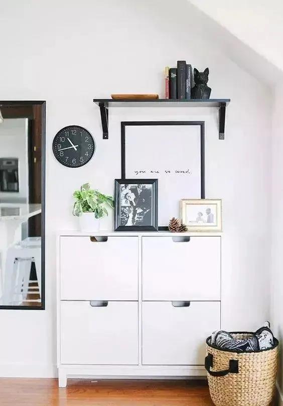 如果玄關(guān)空間不夠大,容積有限,選擇矮柜也是不錯(cuò)的,主要用來(lái)收納鞋子。通常鞋柜之間的高度在15cm-20cm左右,做成活動(dòng)層板,擺放各種高度的女鞋;還有更深的,可以用來(lái)擺放鞋盒。