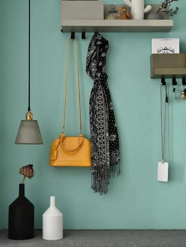 在墻面也可以安裝掛鉤、可以放置鑰匙、帽子、包包等物品,也可以與矮柜、卡座結(jié)合使用。
