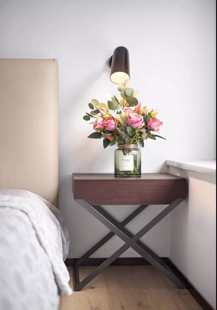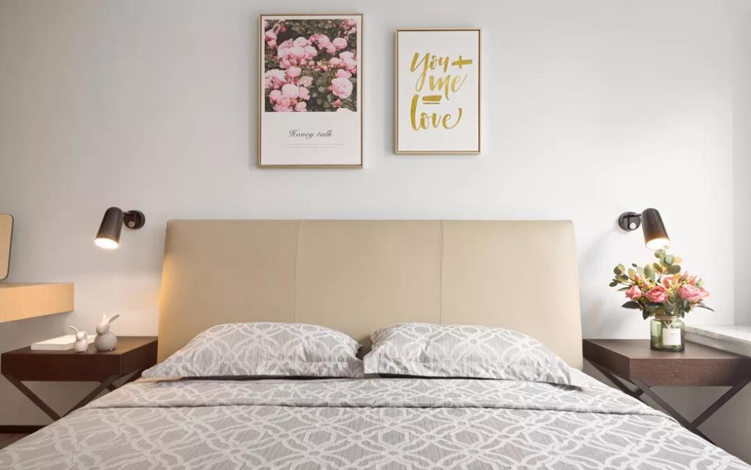 ▲ 床頭背景墻以兩幅畫作裝飾,并與右側(cè)床頭柜上嬌嫩的花朵呼應(yīng),清新優(yōu)雅兼具。