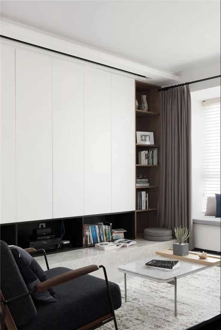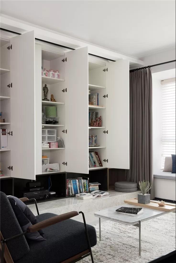 原本的裝飾電視墻改成大型收納柜,L型開放柜裝飾提升立體感。