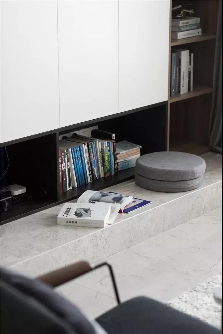 不規(guī)則的轉(zhuǎn)角改成抽屜地柜+墻柜一體,兼具收納和休閑功能。