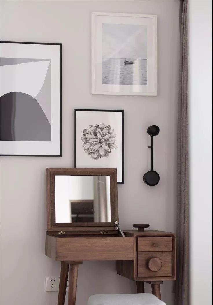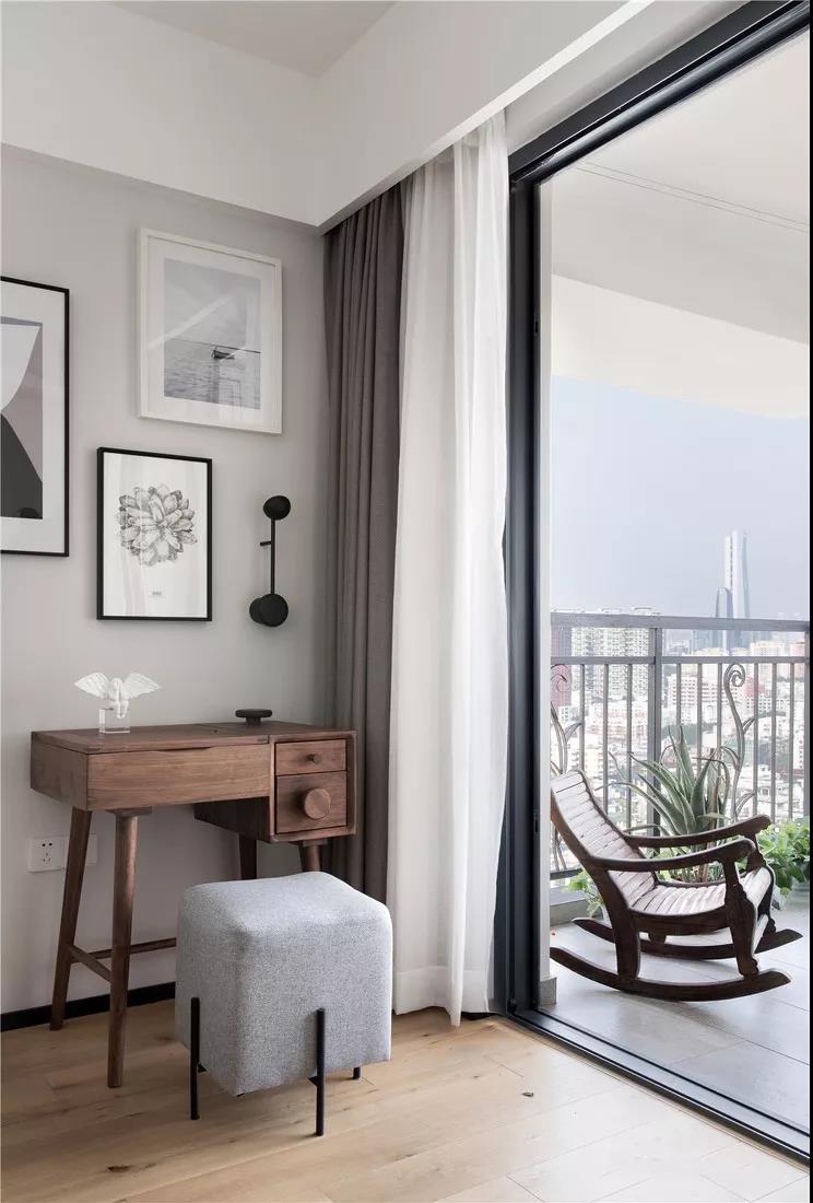 床尾布置休閑區(qū),實木梳妝桌很有設(shè)計感,簡約顯氣質(zhì)。