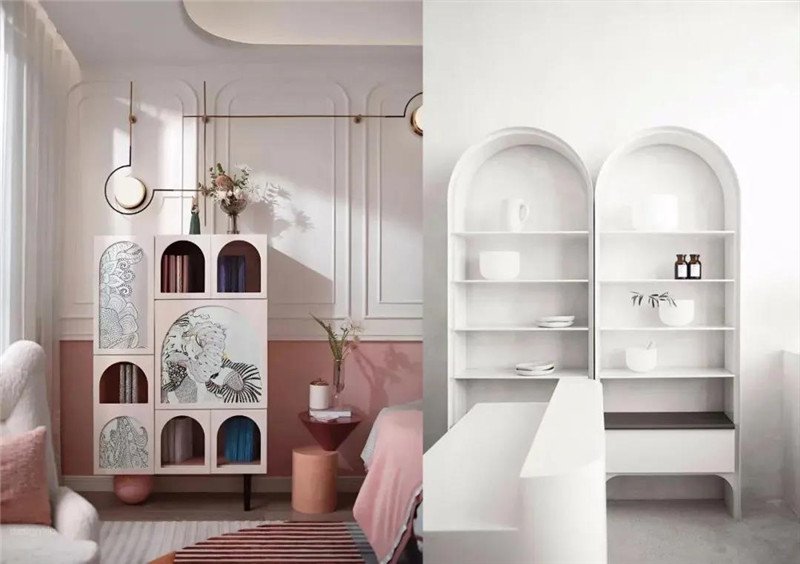 在墻面上內(nèi)嵌拱形的造型,用以滿足辦公學(xué)習(xí),或者化妝、收納、洗手臺(tái)等功能,既滿足高顏值的美觀性,又滿足功能實(shí)用性。