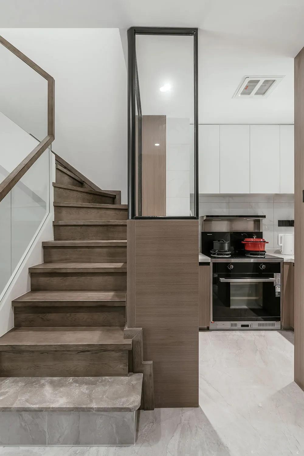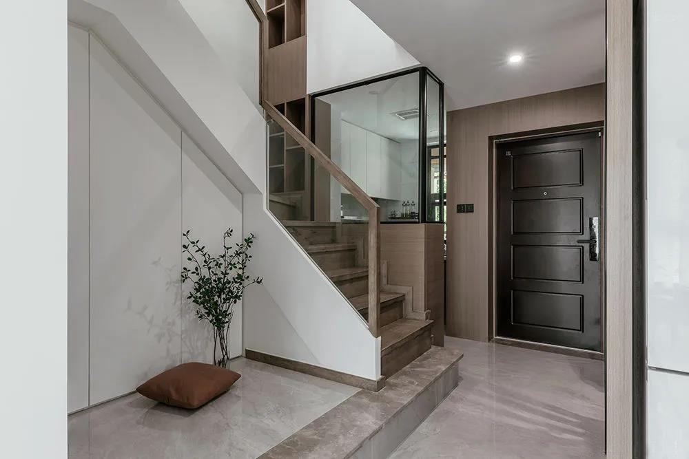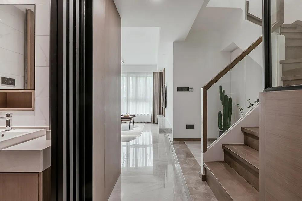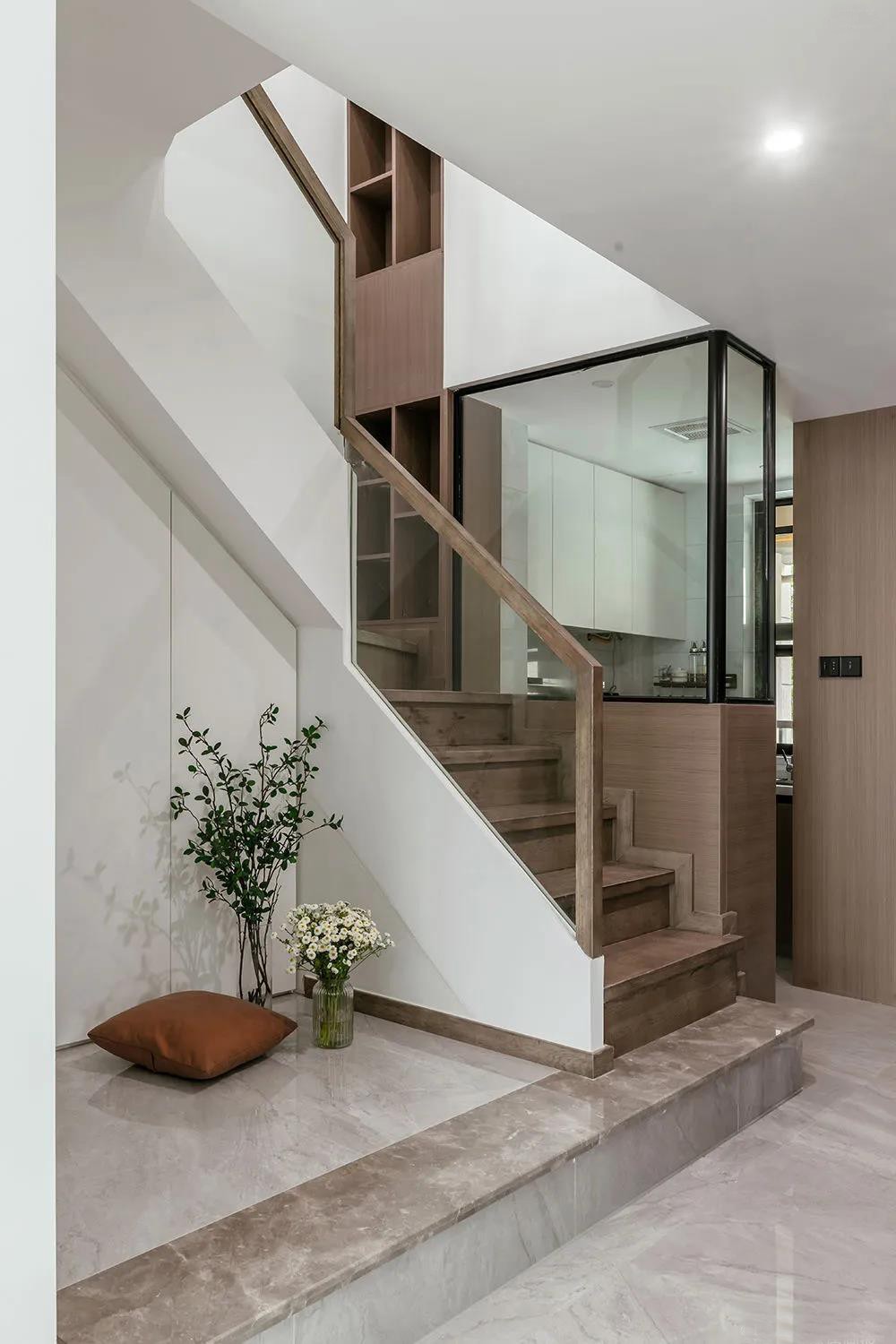 樓梯間頂面的氛圍燈帶設(shè)計,增強照明的同時更添生活情趣。大面積的開放格兼?zhèn)涔δ芘c美觀,玻璃與木制的組合賦予溫暖柔和的氛圍。樓梯第一踏整體抬高,做了貼心弧形設(shè)計預(yù)防日常生活中的磕碰。