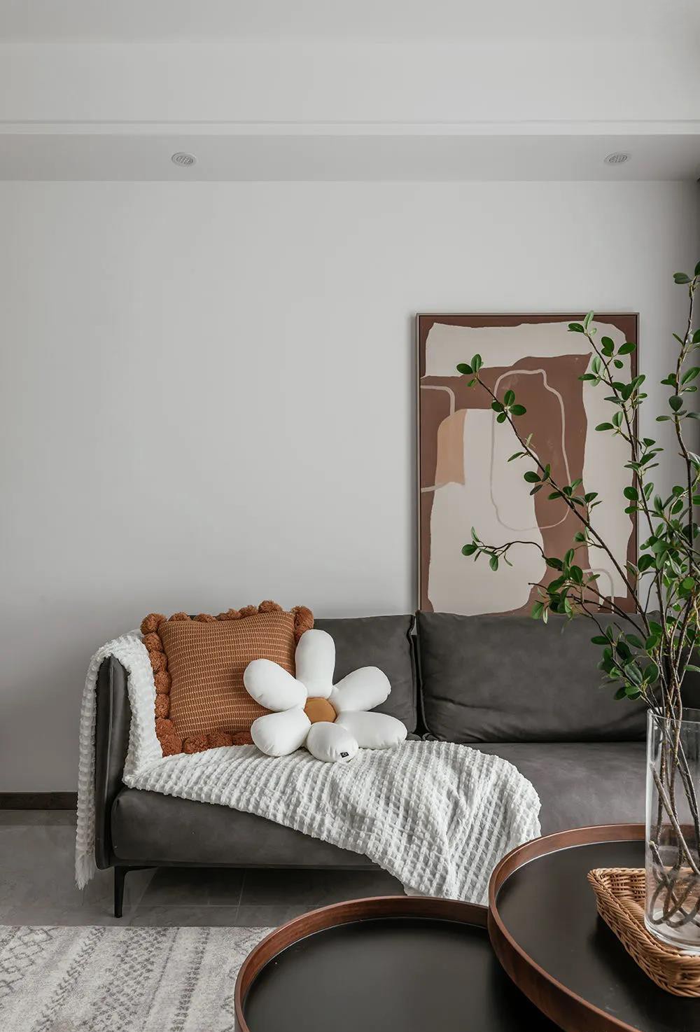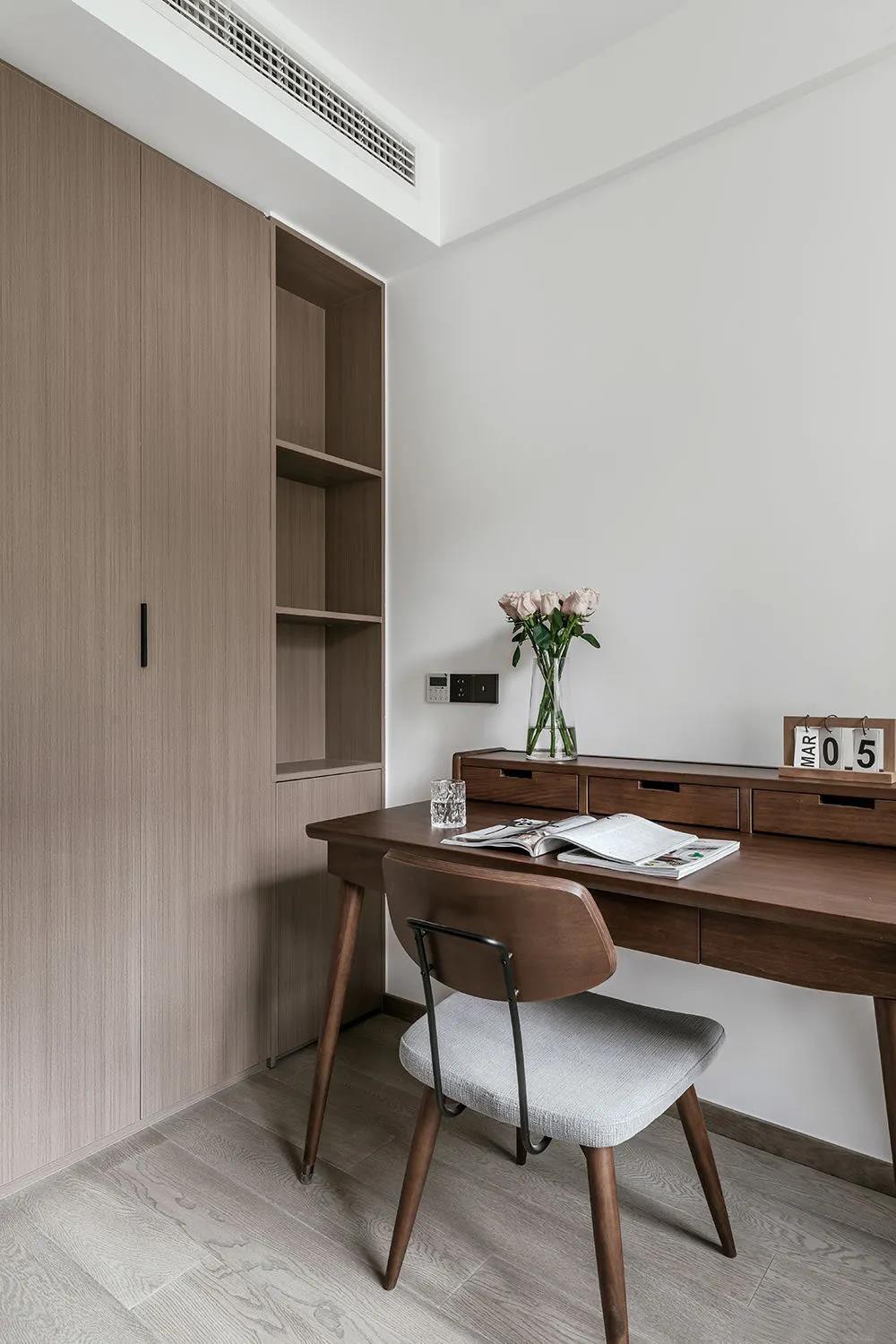 次臥偶爾會留給朋友和父母短暫留宿,暖色調(diào)的床品溫馨舒適,與實木地板、白色衣柜營造北歐風情。