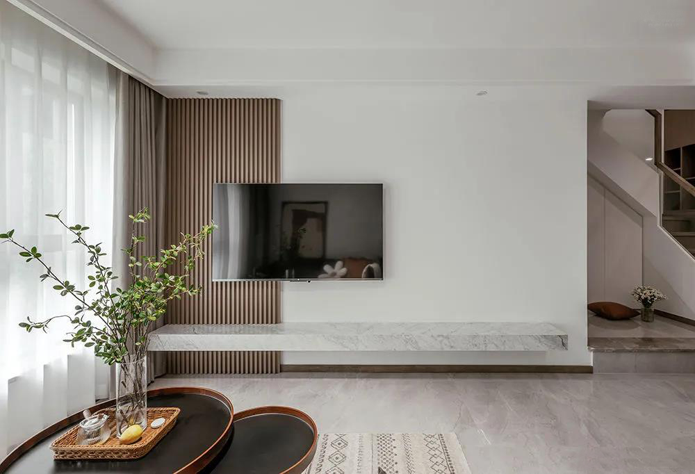 一樓陽臺拆除,擴入客廳,空間更顯明亮開闊。白色大理石的挑出電視柜,簡約雅致。長城板構(gòu)建不對稱的美學(xué)藝術(shù)。不同深度的灰調(diào)交織相融,勾勒出極具北歐風情的家居環(huán)境。