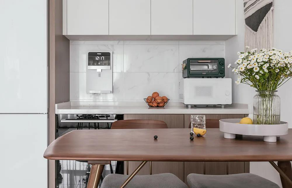 通透的玻璃隔開生活的煙火氣,吊柜與櫥柜提供強大的收納功能。多功能的集成灶及烤箱減少廚房空間占用率,L型操作臺面滿足日常烹飪需求。
