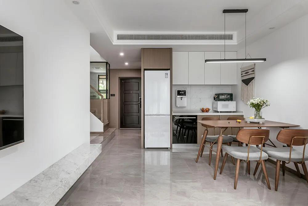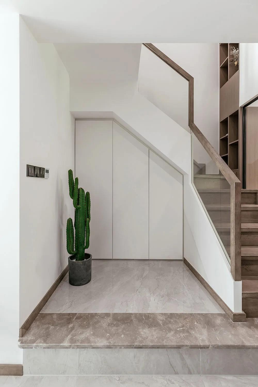 樓梯下方大理石鋪設(shè)而成的休閑區(qū),增強了整體空間的互動性,實木鋪設(shè)的樓梯與整屋質(zhì)樸的風格一樣清新溫暖。玄關(guān)鞋柜做高置頂,將儲物功能極致運用。