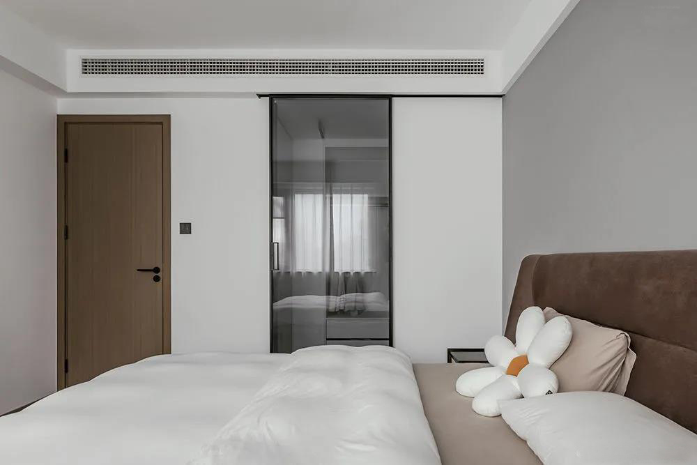 主臥內(nèi)衣帽間隱藏在玻璃推拉門后,兼顧私密與功能性。內(nèi)嵌燈帶賦予敞亮的光線,魚肚白的儲物柜素凈整潔,滿足業(yè)主日常的收納使用。