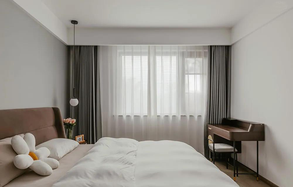 床頭吊燈的線條將藝術(shù)感展現(xiàn),微風與柔光透過幔紗,柔軟舒適的床具包裹著美夢。整體搭配以低飽和度的色彩為主,打造出舒適寧靜的休憩空間。