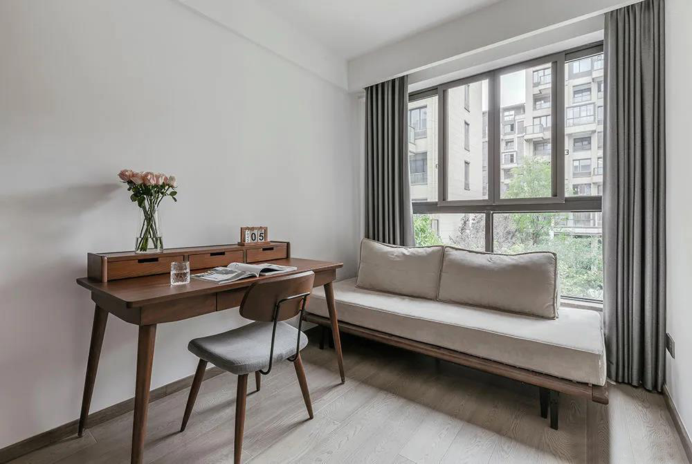 朝西的書房窗外綠色怡人,定制的隔斷柜亦可做書柜使用??椢锩嫔嘲l(fā)床既可日常閱讀休憩亦可作為床榻, 木制的自然紋理攀附于空間之內(nèi),將自然氣息融入其中。