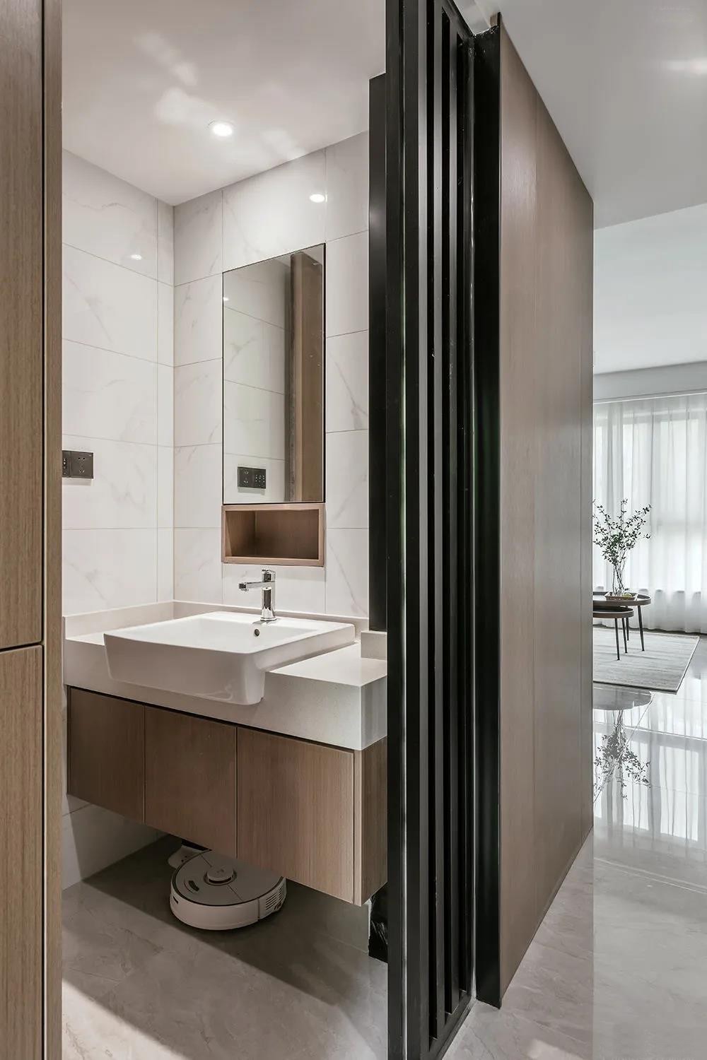 入門左手便是干濕分離的外衛(wèi),體貼入微。翻折式鏡柜搭配著木色的敞開格將自然之美融于其中。外衛(wèi)隱形門使整體的墻面線條流暢,一氣呵成。