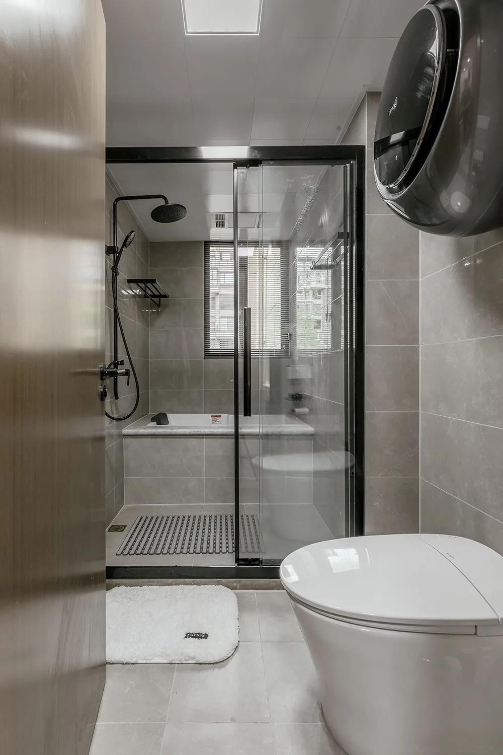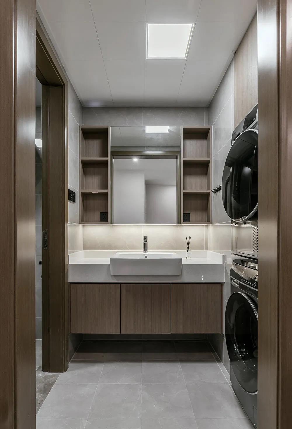 內(nèi)衛(wèi)做干濕三段分離,配置了洗衣機烘干機和智能馬桶,墻面上安裝有內(nèi)衣專用的洗衣機,將智能化現(xiàn)代生活展現(xiàn)淋漓。