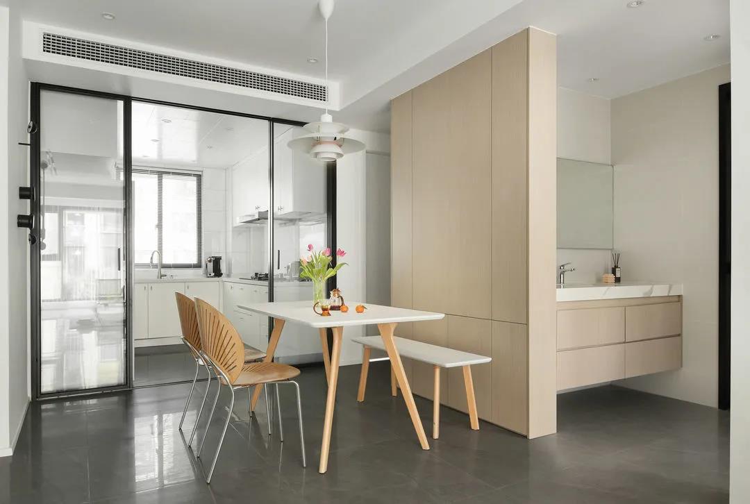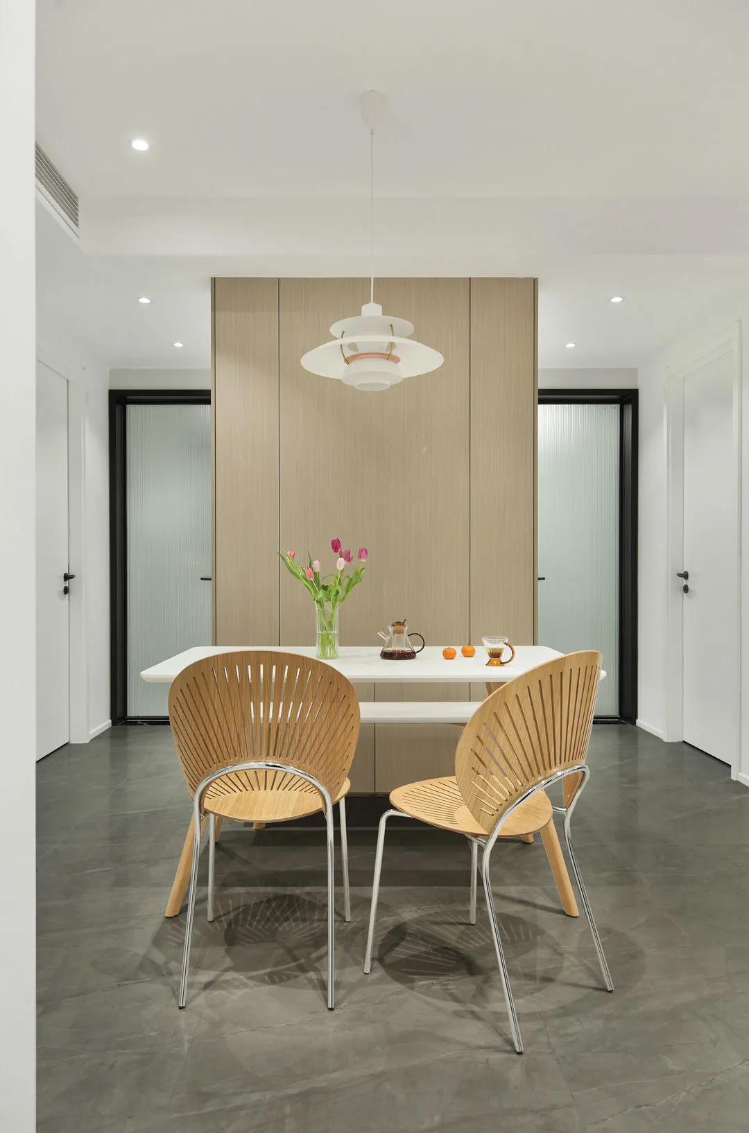 為了效果更協(xié)調(diào)統(tǒng)一,餐廳背景墻利用木飾面裝飾,與雙干區(qū)形成整體。餐廳家具輕巧實(shí)用,占用面積小視覺感更通透。兩把椅子+長凳組合,美觀實(shí)用節(jié)省空間。通透的玻璃移門隔斷廚房,讓餐廳自然采光更充足。