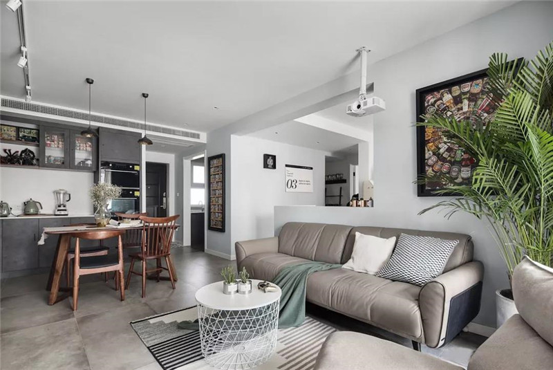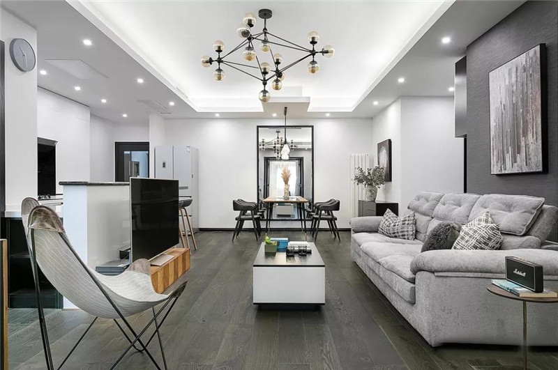 現(xiàn)代風(fēng)格,黑白灰主色調(diào)搭配暖色燈光,線條元素、輕工業(yè)風(fēng)的配飾,營造了利落、時(shí)尚、現(xiàn)代的質(zhì)感