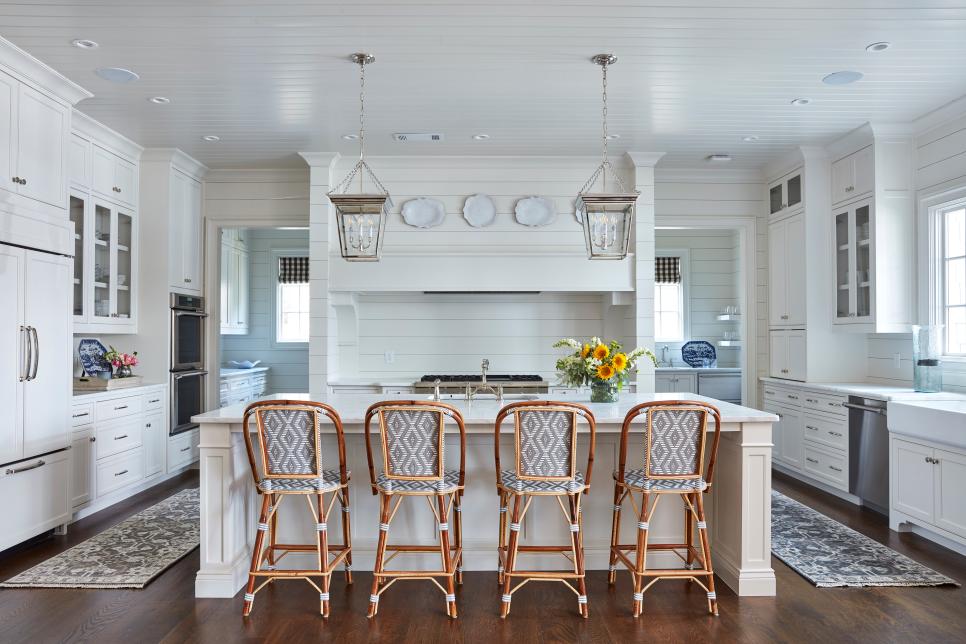 小屋風(fēng)格的裝飾很適合廚房設(shè)計。開放式擱架、彩繪櫥柜和手工配件營造出令人愉悅的烹飪和用餐空間。地中海相遇小屋一些地中海風(fēng)格——枝形吊燈和吊燈——將這個白色廚房帶入